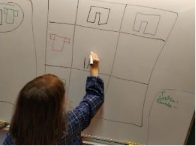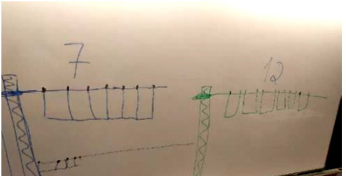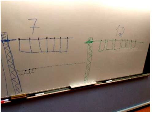 A sétima tarefa compreendeu a resolução de um problema de processo baseado no enunciado clássico de colocar guardanapos a secar, utilizando o menor número de molas possível. Esse tinha como objetivo potenciar o desenvolvimento de diferentes estratégias por parte dos alunos, sendo previsto que surgissem abordagens relacionadas com a exploração de padrões, porventura aliadas a uma representação por desenho.