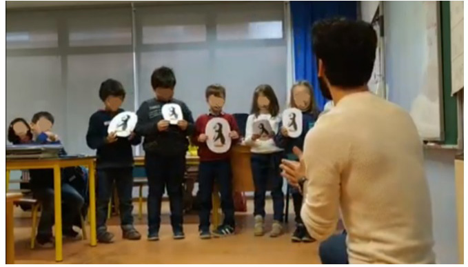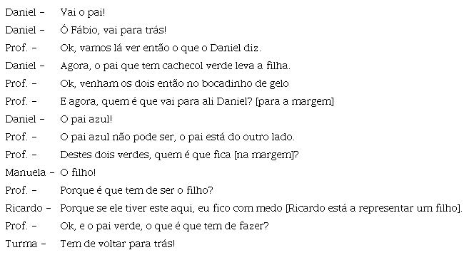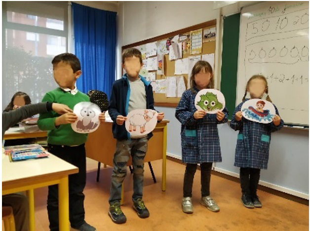 A terceira tarefa teve como âmbito a exploração de uma investigação relacionada com um problema clássico de travessias, nomeadamente uma adaptação do problema lobo, ovelha e couve. Em uma primeira fase, o problema foi abordado de forma dramatizada e oral, pois a abordagem escrita iria complexificá-lo e, possivelmente, inviabilizar a sua execução. Assim, com a ajuda de figuras, foram selecionados quatro alunos, que se apresentaram à turma como sendo os intervenientes do problema ( Figura 4). De seguida, com a ajuda e a participação da turma, todos foram resolvendo o problema, atravessando para um lado e para o outro da sala, imaginando estar em ambas as margens de um rio.