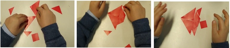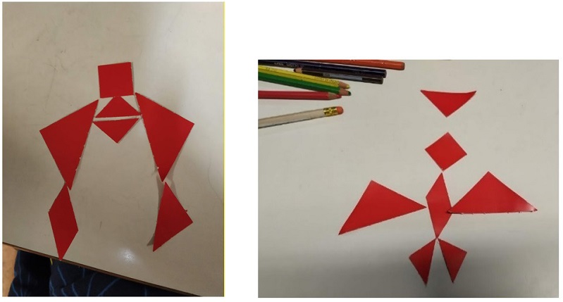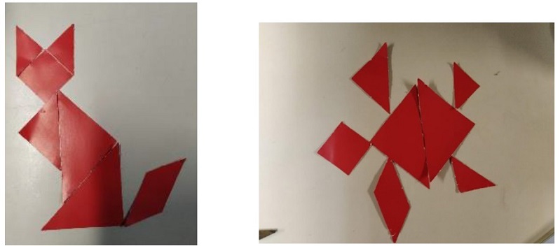 A nona tarefa surgiu com base na exploração do tangram. Esse recurso não surge usualmente identificado como um meio para o desenvolvimento de problemas. No entanto, ressalva-se que os alunos se encontravam no início da escolaridade, pelo que muitos não tinham ainda interagido com o material didático. O enunciado da tarefa foi simples: depois de explorar o material, conseguir construir figuras semelhantes às que estavam representadas no quadro, da forma mais autônoma possível ( Figuras 17 e 18).