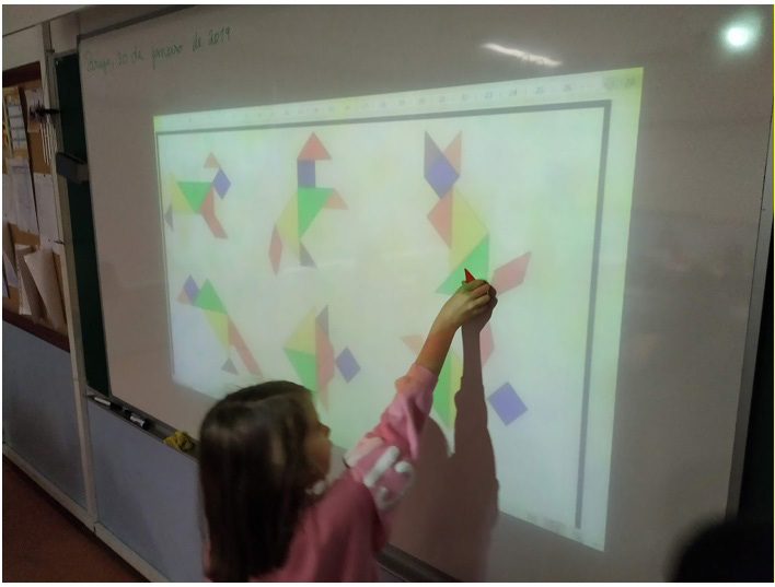 No início, alguns alunos sentiram dificuldades, não estando acostumados com algumas das formas presentes no tangram. Assim, foi-lhes dada a oportunidade de comparar as suas peças com as projetadas no quadro, para tirarem as suas dúvidas sobre a forma das peças e respectiva disposição ( Figura 20).