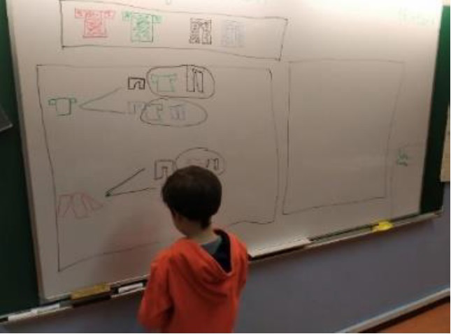 A segunda tarefa consistiu na resolução de um problema de processo que potencializa a construção da estratégia trabalhar do fim para o início. Em uma primeira fase, houve espaço para uma resolução individual, depois de uma leitura conjunta, seguida de uma fase de discussão e resolução conjunta no quadro ( Figura 3). Alguns alunos obtiveram sucesso na resolução individual, assumindo o protagonismo da explicação na resolução conjunta, tendo outros demonstrado algumas dificuldades de interpretação. Um aluno explicou que tentou resolver o problema através de adições sucessivas, enquanto outros utilizaram desenhos. Isso levou a que a resolução conjunta representasse os dois processos.