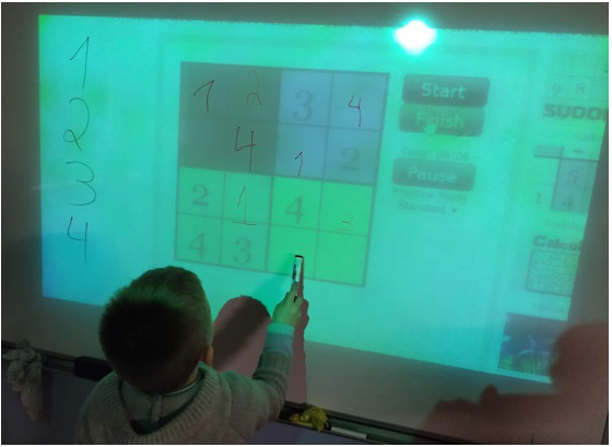 A quinta tarefa relacionou-se com um desafio de Sudoku. Depois de um pequeno diálogo para perceber se os alunos já tinham tido contato com algum exemplar, e da explicação do enunciado, os alunos mostraram-se muito motivados para a sua resolução, tendo demonstrado grande capacidade de resolução ( Transcrição 2). Ao longo da tarefa foram identificadas algumas estratégias de resolução, tais como a dedução lógica/eliminação ou a formulação de tentativas/ conjecturas.