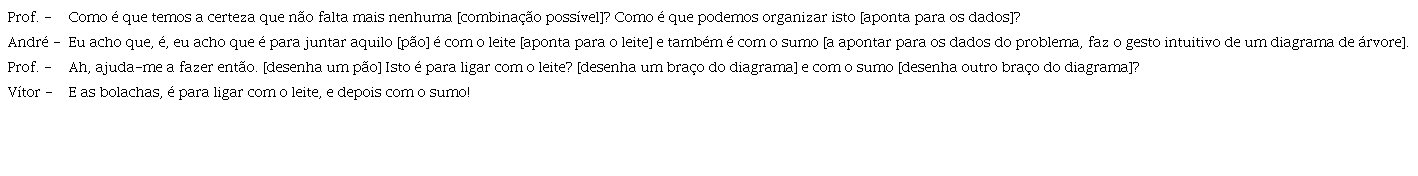 Em seguida, procedeu-se ao estabelecimento de um plano, quando surgiram novos desafios: os alunos começaram, instintivamente, a propor algumas soluções avulsas ao problema, sem a preocupação de estabelecer um plano e obter todas as soluções. Foi necessário o alerta para a necessidade de se pensar uma estratégia. A resolução de problemas por meio de um esquema ou de uma tabela, sendo das estratégias menos próximas dos alunos, quer seja pelo tipo de problema (que normalmente envolve um processo combinatório), quer seja pelo uso da estratégia em si (que não é muito usual na resolução de problemas, no 1º ano), representou um desafio. No entanto, depois de algum tempo para pensar e algumas perguntas orientadoras, surgiu a sugestão de criar um esquema/diagrama para dar resposta ao problema, tendo essa sugestão aparecido sob a forma de gestos, tal como mostra a Transcrição 1: