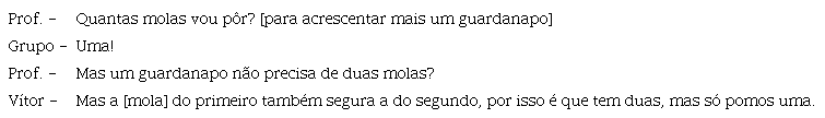 A partir da contraposição das duas propostas, surgiu então a partilha de argumentos a favor de cada uma das perspectivas. Com a discussão, o grupo foi gradualmente reconhecendo a solução mais eficaz (o número mínimo de molas utilizadas), percebendo a regularidade das molas ( Transcrição 3).