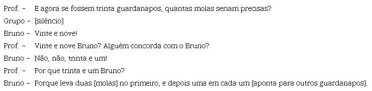 Ao entender que os alunos estavam prestes a perceber o busílis do problema, foi potencializado o salto para uma pequena investigação, questionando quantas molas seriam necessárias se existissem mais guardanapos, com o expoente máximo no número trinta. Foram obtidas algumas respostas coerentes, com uma boa compreensão da regularidade, levando a que os alunos desenvolvessem uma lei de formação, uma das estratégias mais complexas para esse tipo ( Transcrição 4).