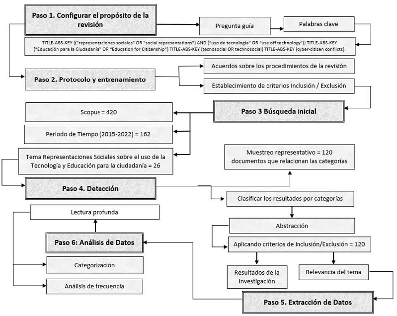 La búsqueda se delimitó dentro de Scopus y Scielo debido al amplio espectro que cubren estas plataformas en idioma inglés, español y portugués. De este modo, la revisión se llevó a cabo con base en los pasos mencionados por ( OKOLI and SCHABRAM 2010), según se observa en la Figura 2.
