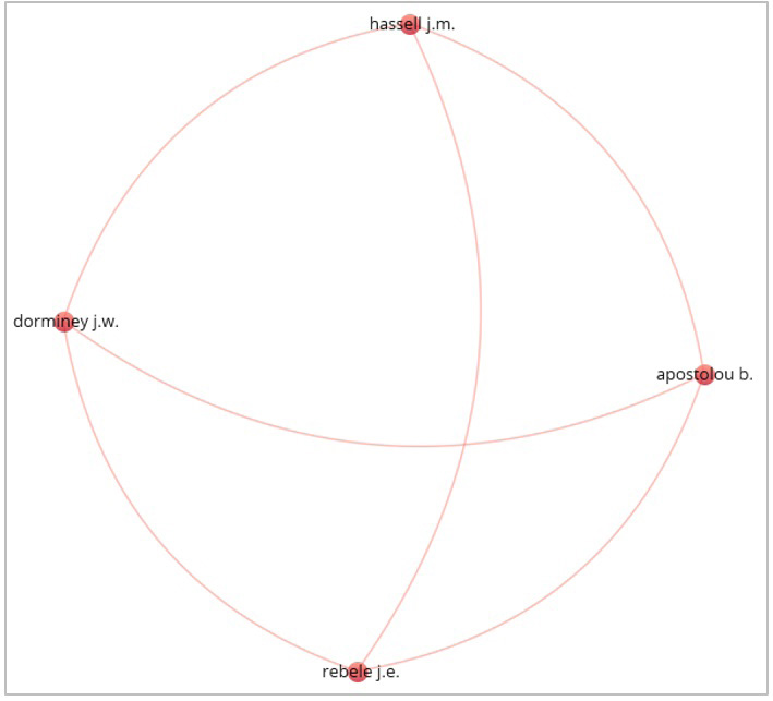 La Figura 4 muestra un alto nivel de acuerdo con la citación frecuente de estos autores y sus prácticas de coautoría. Gráficamente se observa la correlación y el interés conjunto por la asignatura de didáctica y currículo, a partir de los recursos didácticos.