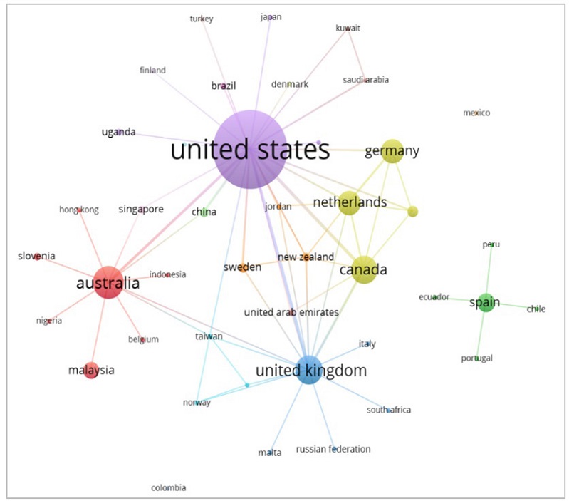 El Reino Unido, con revistas como Medical Teacher con 166 citas y BMC Medical Education con 87 citas, y EE. UU. ( CBE Life Sciences Education Journal) destacan por el mayor número de citas. Asimismo, Estados Unidos y Australia cuentan con un elevado número de coautorías entre países, según las líneas del mismo color que conectan un país con otro (Figura 5). Este hallazgo respalda el análisis obtenido por la Tabla 1, sobre las 10 principales revistas indexadas con la mayor contribución a la revisión, según Scopus.