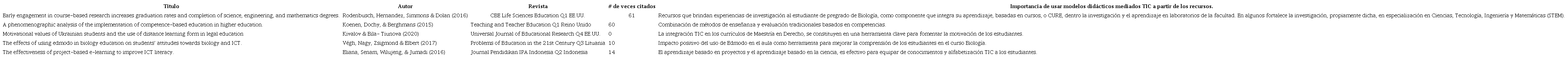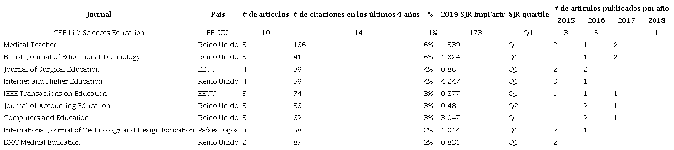 Otro factor de análisis para la revisión fue la disminución de publicaciones sobre el tema entre los años 2017 a 2018, con solo una publicación sobre los modelos didácticos mediados por las TIC, en la revista CBE Life Science Education, con publicaciones sobre el tema hasta 2018. Por su parte, la revista BMC Medical Education solo publicó dos artículos de didáctica y modelos pedagógicos mediados por TIC en 2015.