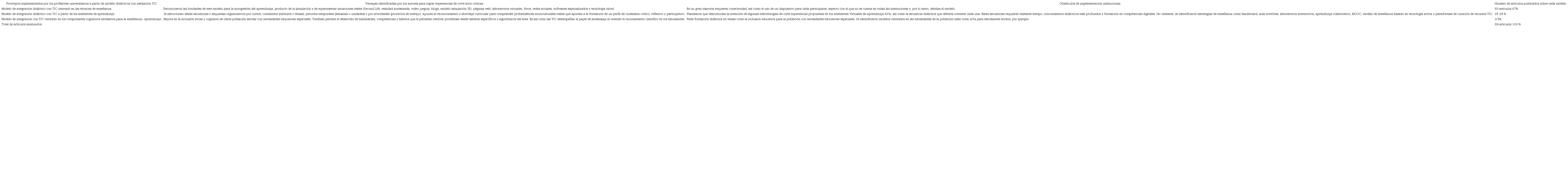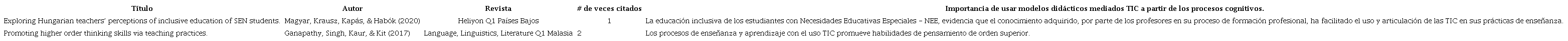Finalmente, al revisar la literatura sobre la implementación docente de modelos didácticos mediados por las TIC centrado en las estrategias de enseñanza, identificamos estudios cuyo interés radica en aspectos como las Necesidades Educativas Especiales (NEE) y las habilidades de pensamiento superior (Tabla 5).