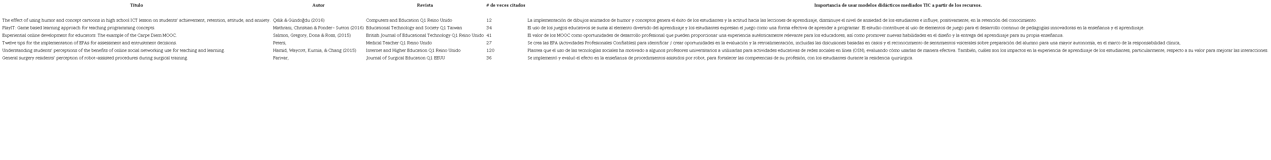 Un aspecto que destaca en esta revisión sistemática son las disciplinas que valoran la implementación para la docencia, como la Medicina, la Ingeniería y la Educación. La Tabla 3 muestra algunos ejemplos destacados de artículos específicos que declaran, a partir de las decisiones docentes de los docentes, la importancia de utilizar modelos de enseñanza mediada por las TIC basados en recursos ( JIMÉNEZ and SEGOVIA 2020).