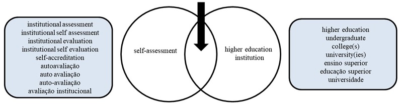 The selection process of the bibliographic portfolio, the first stage of ProKnow-C, begins with the definition of research axes and their keywords ( Figure 3). For searching the databases, keywords in English were used, in addition to their respective translations and adaptations to the Portuguese language. Our study focuses on studies on institutional self-assessments in higher education institutions.