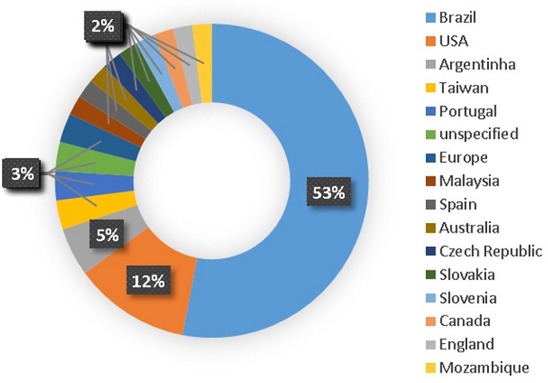 Figure 5 shows that Brazil was the country with the most articles published on the selected subject, followed by the United States of America and Argentina. The other countries had a small number of studies carried out on the subject.