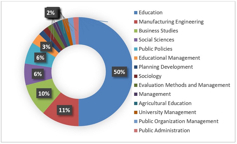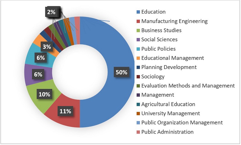 More than half of the theses and dissertations in the bibliographic portfolio were from the area of Education, followed by Production Engineering and Administration, respectively ( Figure 7).