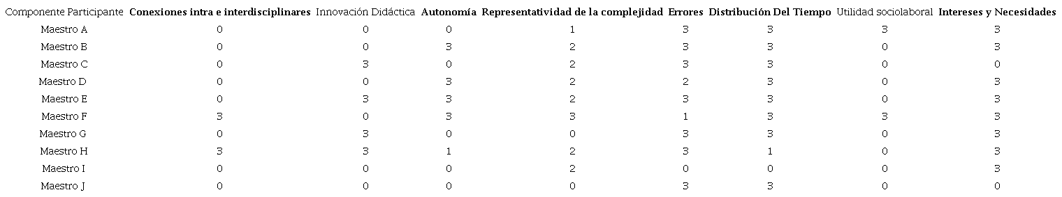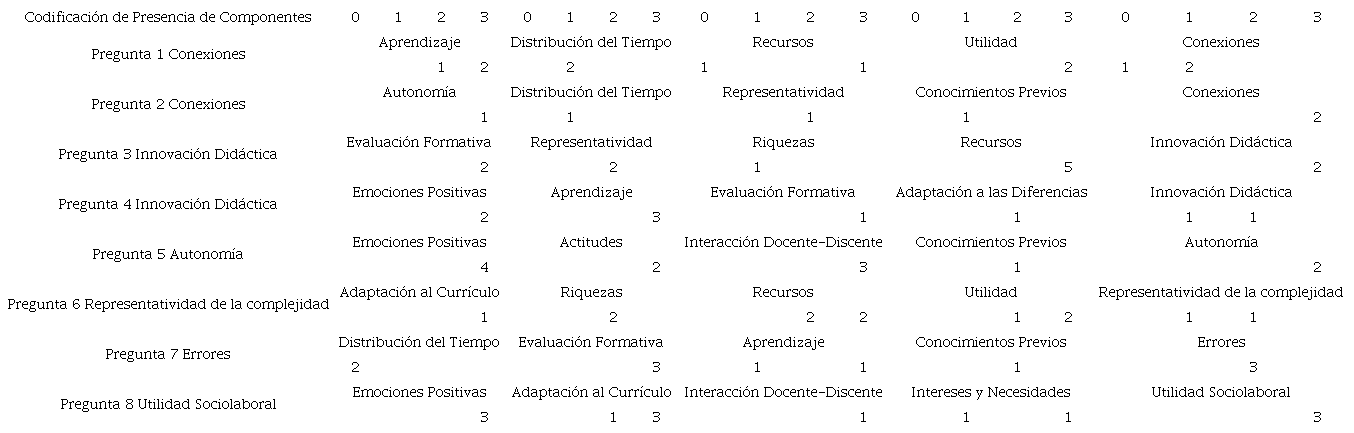 A manera de resumen, la Tabla 5 muestra los resultados descritos en los párrafos anteriores. En la parte superior de la Tabla 5 está la codificación de la presencia para cada componente encontrada en las unidades semánticas de la transcripción. Cada pregunta se ha colocado en una fila con su respectivo componente, vinculándola con otros componentes que aparecieron en las respuestas de las personas entrevistadas. Por ejemplo, en el caso de la tercera pregunta, las personas entrevistadas mostraron respuestas que tomaban como referencia componentes como la evaluación formativa, la representatividad, o los recursos materiales ( Tabla 2) para la presentación de sus ideas. En particular, los cinco maestros indicaron emplear siempre (alta presencia) el uso de recursos materiales cuando se les preguntó sobre el componente de innovación didáctica del criterio ecológico.