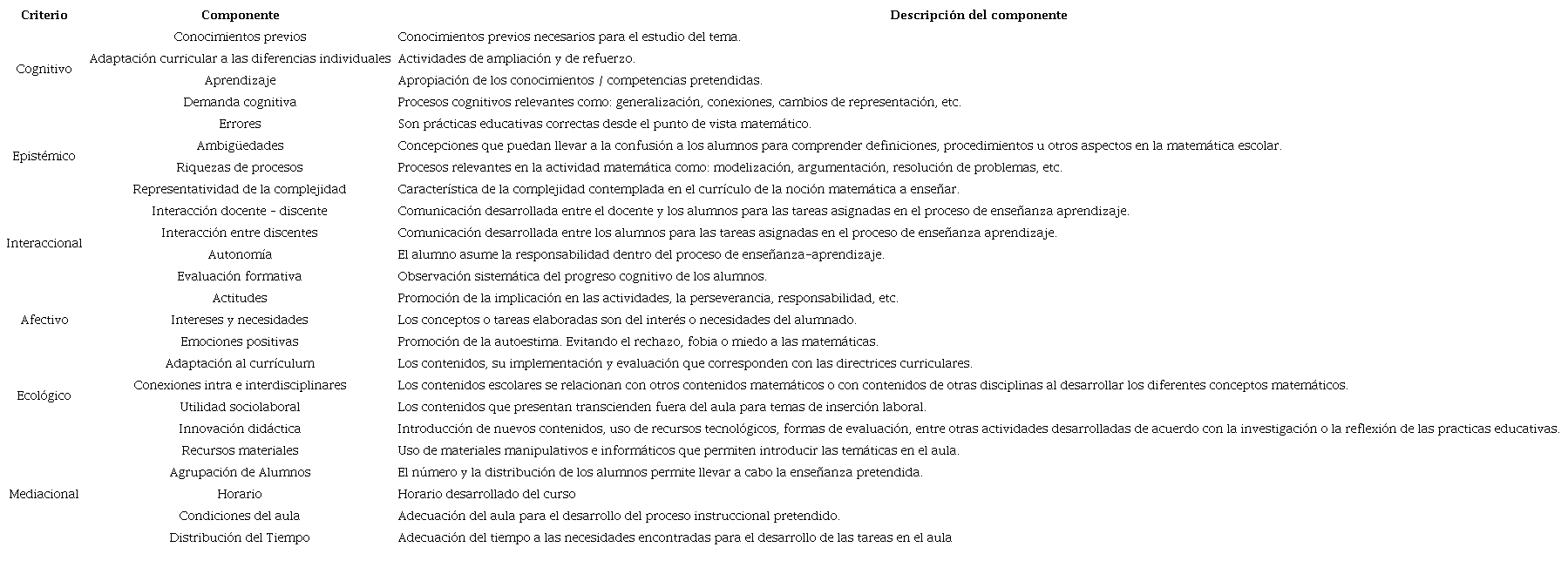 Criterio epistémico, que valora si las matemáticas enseñadas son unas buenas matemáticas o no, o lo que es lo mismo, la implicación del grado de representatividad del concepto propuesto en la clase en referencia con su significado completo en el currículo.
