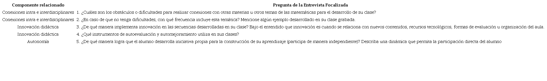 La Tabla 3 muestra algunas de las preguntas a las entrevistas realizadas a los maestros en forma individual. Se trata de una entrevista semiestructurada, de manera que las preguntas se ajustaron según la disposición de las personas entrevistadas a responder cada una de ellas, para respetar su discurso natural.
