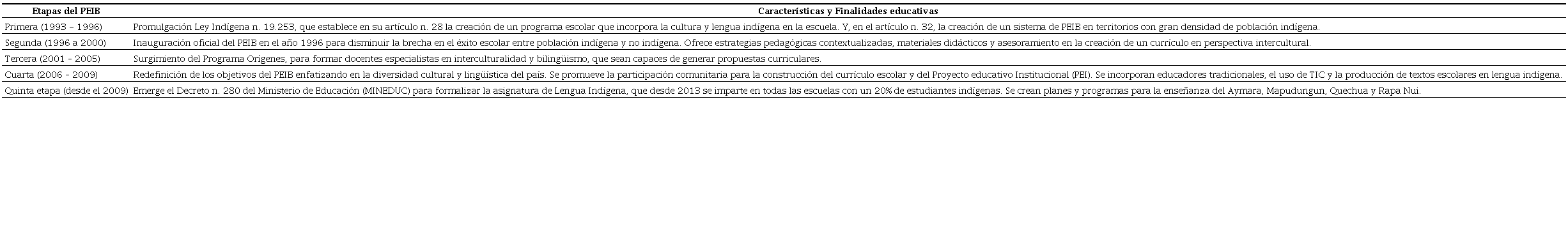 En Chile se ha implementado como política pública el Programa de Educación Intercultural Bilingüe (PEIB), que desde 1996 busca incorporar la enseñanza de la lengua y la cultura indígena en la educación escolar para favorecer la contextualización curricular en territorios indígenas (CHILE, 2010). Este programa se ha caracterizado por las siguientes etapas (ver tabla 1).