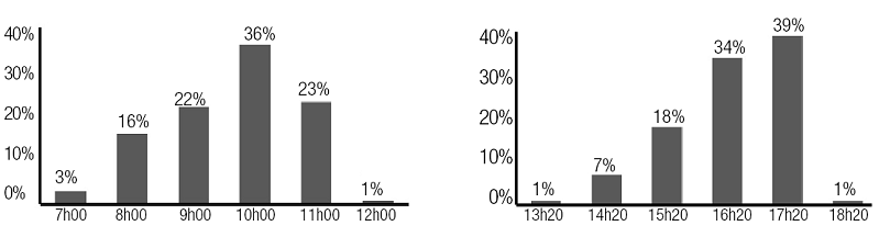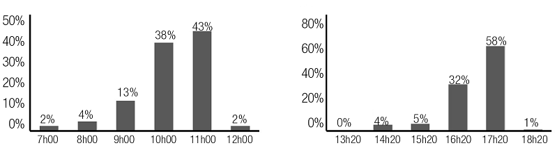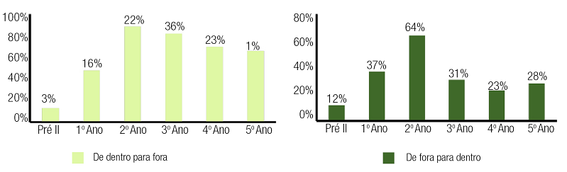 Ao analisar o gráfico considerando as duas variáveis aqui estabelecidas, nota-se que o período da manhã tem uma mudança de horário com maior fluxo de saída quando se observam apenas os alunos que foram retirados por seus responsáveis, ou seja, que se enquadram na ideia de saída “de fora para dentro”. Nessa perspectiva, o horário com maior índice de saída encontra-se entre 11 horas e meio-dia com 43%. O horário da tarde, entretanto, continua com seu fluxo maior no horário de 17h20min até às 18h20min, mas com um aumento considerável para 58% dos casos. O gráfico com as saídas “de dentro para fora” mostra-nos que quando a escola é a responsável por enviar os alunos para casa, esses tendem a sair mais cedo do que quando os responsáveis vão buscá-los. O período da manhã manteve seu índice aproximado de 35% nas saídas no período entre as 10 e 11 horas, assim como no índice geral. O período da tarde, por sua vez, teve uma pequena queda de 39% para 36%, mas o horário se distanciou do término das aulas ficando com maior índice de saídas entre as 16h20min e 17h20min.