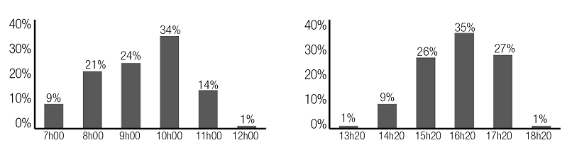 Ao analisar os horários que mais demandam saída dos alunos, é importante constar que o número de alunos analisados não será do total de 570, mas, sim, de 542 alunos. Isso se dá pelo fato de que dos 570 alunos, 26 são da Pré-escola e em dois casos não foi atribuído o horário do aluno na Ata, o que impossibilitou a identificação da hora correta. No caso dos alunos da Pré-escola, por estudarem em um horário diferenciado, os dados coletados não poderiam ser analisados junto aos demais para não gerar possíveis interferências nos resultados. Dessa forma, foi notado que o período da manhã teve um total de 195 saídas ou 36% do total, enquanto o período da tarde apresentou 347 saídas ou 64%, de modo que o período da tarde tem duas vezes mais saídas em relação ao período da manhã. Tal dado é importante, pois possibilita observar as razões e motivos que estão por trás desse aumento e fazer, assim, um trabalho para diminuir esses números.