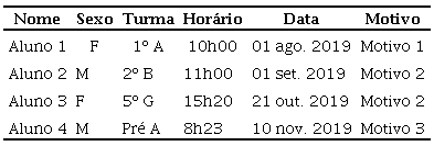 Motivos: classificar em ordem decrescente os principais motivos pelos quais os alunos saem mais cedo é o ponto chave nesta pesquisa e sabê-los é o que auxiliará a gestão da escola no planejamento de estratégias a serem utilizadas. Como os motivos são os mais diversos possíveis, foi necessário criar uma regra de padronização para eles a serem descritos no livro Ata de saída antecipada. Para exemplificar de forma simples, pode-se dizer que sempre que um aluno sair mais cedo para ir ao médico, seja ele qual for, apenas será escrito médico. Da mesma forma, quando o responsável pelo aluno não assume um motivo claro e específico ou por alguma razão de privacidade opta por não o dizer, é escrito apenas pedido do responsável.