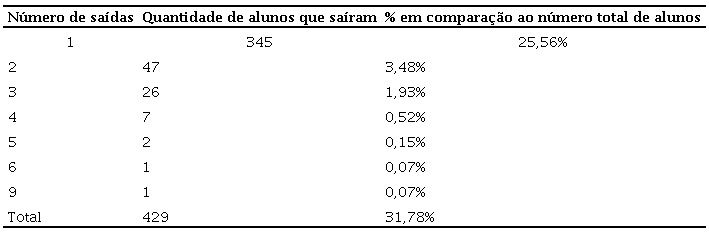 Durante esse período, houve saída antecipada de 570 alunos antes do período de término diário das aulas, o que significa que 42,22% do total de alunos da escola saiu mais cedo. O segundo semestre contou com 98 dias letivos, o que resulta em uma saída de cerca de 5,8 alunos por dia. Entretanto, sabe-se que o número de saídas não corresponde ao número de alunos que saíram, uma vez que um único aluno pode ter se ausentado mais de uma vez. A pesquisa demonstrou que das 570 saídas, 225 foram atribuídas mais de uma vez a um mesmo aluno, ou seja, 429 alunos distintos saíram antecipadamente durante o período analisado. Em porcentagem, significa uma saída de 31,78% da quantidade total de alunos matriculados na escola. Entretanto, apenas 6,22% do total de alunos matriculados saiu mais de uma vez. Nota-se, também, que na maior parte das vezes os alunos se limitaram a duas ou três saídas. O maior número de saídas atribuído a um único aluno foram 9. Na Tabela 2, é possível observar com clareza esses dados.