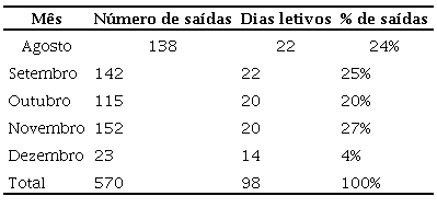Os meses referentes ao segundo semestre apresentaram números parecidos com exceção do mês de dezembro que apresentou apenas 4% do total de saídas. Dezembro, entretanto, é o mês com menor número de dias letivos, o que reflete também no número de saídas, cerca de uma por dia. Os meses de agosto, setembro e outubro apresentam números de cerca de 6 saídas por dia, enquanto o mês de novembro, com maior número, apresenta cerca de 7.