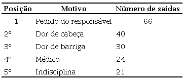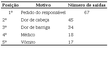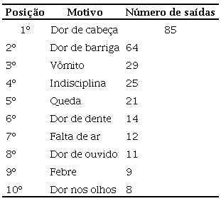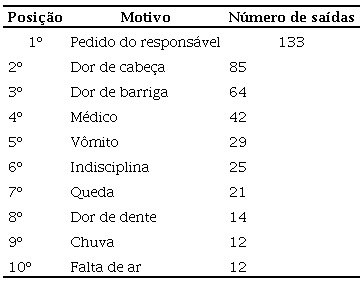 O ranking mostra-nos que os principais motivos estão relacionados a queixas de doenças entre os alunos. Das 10 posições, 8 estão relacionadas a algumas situações de queixa de dor, sendo que dor de cabeça está no topo da lista, seguida de dor de barriga. Segundo Grunspun (1999), queixas somáticas ou sintomas físicos que incomodam as crianças podem provir de sintomas emocionais, sendo os mais comuns, dor de cabeça, dor de ouvido, dor de garganta e dor de barriga. Além disso, os alunos que apresentam maiores índices de dores de cabeça estão diretamente relacionados à dificuldade em fazer os deveres em sala de aula (ENUMO; FERRÃO, RIBEIRO, 2006).