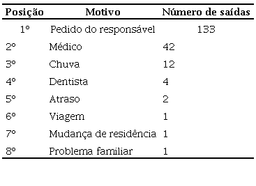 Tanto no ranking de meninos quanto no de meninas, as posições permanecem quase idênticas aos índices gerais, o que mostra que não faz diferença o sexo da criança em relação aos motivos principais. Entretanto, em 1º lugar aparece pedido do responsável que assim foi descrito quando esse vai até a escola solicitar a saída antecipada e não dá um motivo específico para isso, apenas argumenta que quer levar o aluno e assim o faz. Médico também aparece na tabela, tanto na geral quanto na dividida por sexo, que se refere ao aluno cujo responsável foi buscá-lo antecipadamente para levá-lo ao médico. Nas 5ª e 6ª posições aparecem, respectivamente, vômito e indisciplina, que se referem aos alunos que foram embora por estarem vomitando ou que, por indisciplina, foram enviados mais cedo para casa.