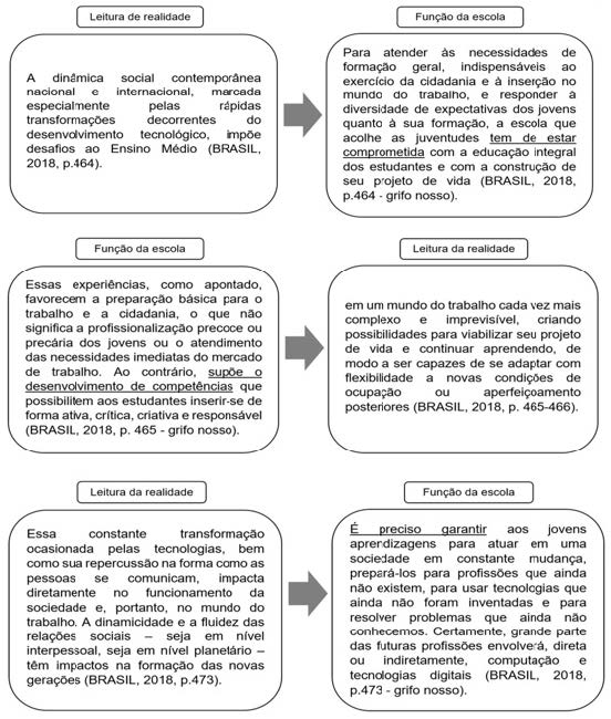 Na análise realizada, buscamos identificar a produção de entendimentos sobre a realidade com atenção às intencionalidades do discurso produzido. Essa intencionalidade revela-se na produção de concepções acerca da função da escola, visto que um problema, logo que identificado, demanda uma solução ou, por sua vez, uma intenção pedagógica demanda a justificação com base em um problema identificado. A função da escola está associada à produção de um tipo ideal de sujeito, o que significa dizer que a intenção pedagógica é sempre política, uma vez que atende a interesses sociopolíticos (LIBÂNEO, 2010). Vejamos nos destaques extraídos da BNCC como isso ocorre na Figura 1: