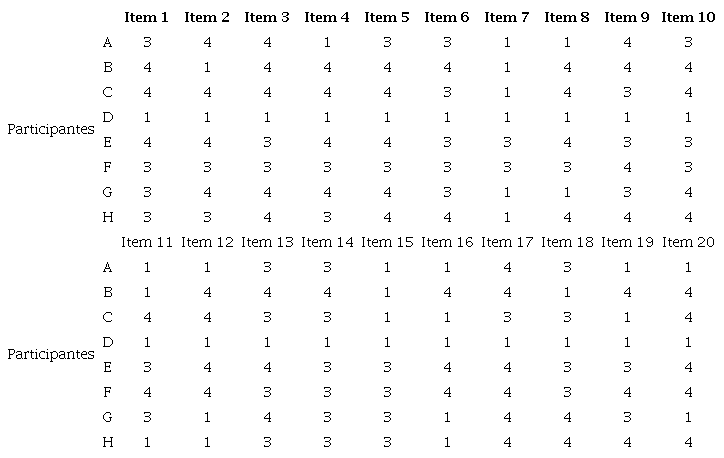 Após o retorno do questionário dos participantes, categorizados de A a H, o instrumento foi analisado quanto à sua validade e confiabilidade. A confiabilidade e a validade são duas propriedades de medida estreitamente relacionadas, que desempenham papéis complementares. A confiabilidade, medida através da consistência interna, diz respeito à homogeneidade das respostas dos distintos avaliadores, enquanto que a validade representa o grau de certeza sobre o conceito medido (DE BEM et al. , 2011).