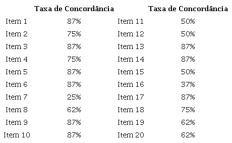 Acerca dos itens do instrumento que apresentaram-se adequados para o objetivo proposto, conquistando taxa de concordância entre os avaliadores de 87%, atribuiu-se, à tal desempenho, sua definição objetiva e a conformidade entre os conceitos avaliativos e a descrição dos itens.