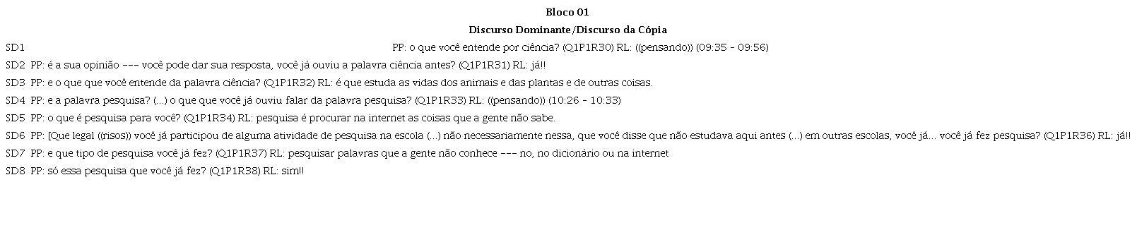 No Bloco 01, tabela 1, reproduzimos um fragmento da entrevista realizada com o estudante RL. Evidenciamos indícios do “discurso dominante sobre ciência” e do “discurso da cópia”.