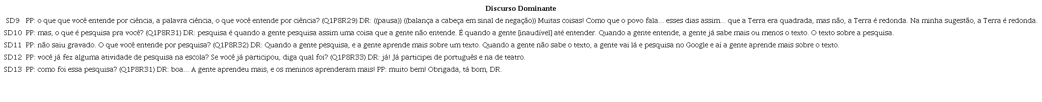 Na SD9, os dizeres de DR sobre ciência remetem a teorias pseudocientíficas da nossa contemporaneidade. Falsas crenças criadas em torno de conhecimentos científicos, a exemplo dos movimentos antivacinas 10 e do terraplanismo, surgem no debate político, em uma tentativa de mascarar os dados, forjando o imaginário da era científica. Conforme Bezerra (2020, p. 21), “a crença na terra plana é só um sintoma de um fenômeno maior e bastante popular no Brasil: a onda de negacionismo científico, a qual gosto de chamar carinhosa e metonimicamente de terraplanismo, que se espraia por diferentes áreas do conhecimento” 11. DR é a favor do discurso da ciência, provavelmente por conta de sua memória escolar que reverbera o modelo da história das ciências ( CHASSOT 2004).