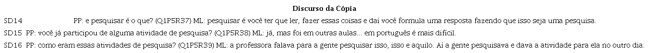 O que de fato é pesquisa fica demonstrado na modalização dos seguintes termos: “fazendo com que isso seja pesquisa”. A imagem construída do estudante nos deixa entrever as cópias ou paráfrases de textos originais a partir de leituras realizadas. Ou seja, a questão da não autoria da pesquisa é deslocada para a SD16, que equivale a uma simples atividade, ou melhor, uma cópia (ou paráfrase) que deve ser entregue à professora no dia seguinte. Só mesmo uma pesquisa simplificada (talvez, uma consulta ou busca por informação) poderia ser realizada em aproximadamente 24 horas.