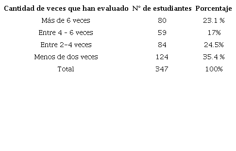 Una de las preguntas esenciales en el instrumento y que ha servido para este estudio ha sido conocer la cantidad de veces que los estudiantes han evaluado a sus docentes, ya que esto posibilita saber el nivel de experiencia que tienen con este proceso y obtener respuestas más pertinentes vinculadas con su experticia.