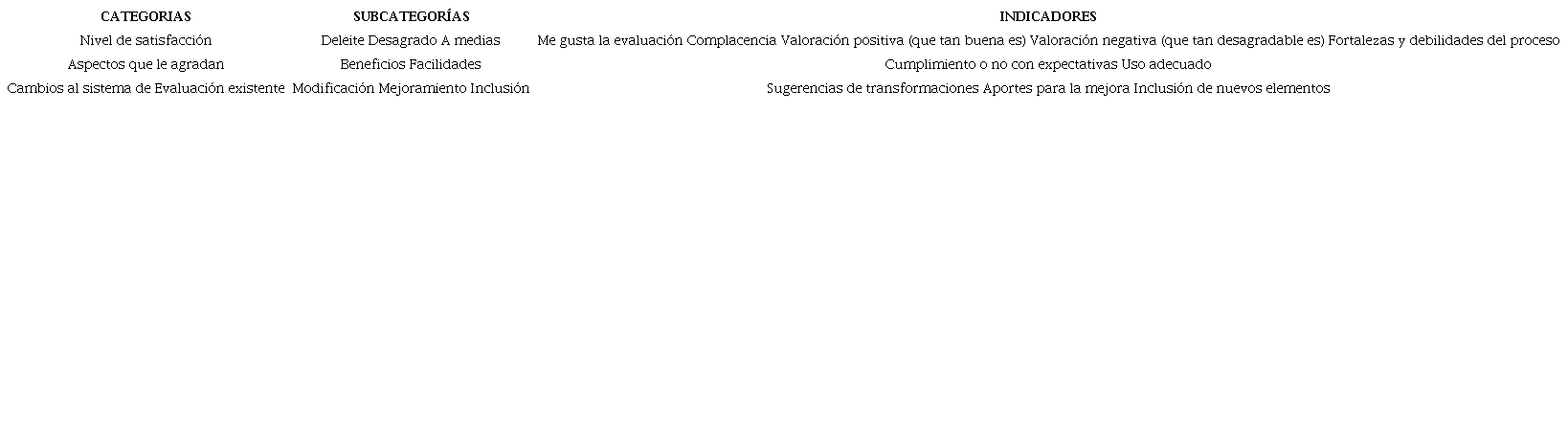 Mediante la categorización se puede delinear un procedimiento de categorías para instaurar conceptos existentes en las informaciones analizadas. De este procedimiento se han empleado las categorías a priori, ya que están establecidas por los objetivos del estudio. En la tabla siguiente esbozamos las categorías, subcategorías e indicadores que se fueron definiendo para analizar las informaciones que brindaron los estudiantes sobre su visión acerca de la evaluación del profesorado.