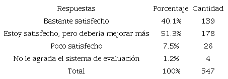 Para saber el nivel de agrado o desagrado que tienen los estudiantes en relación al instrumento de evaluación del profesorado, se les cuestiona acerca de sus consideraciones sobre si este sistema evalúa con precisión todas las competencias que debería tener un profesor universitario y por qué. En torno a esto, las respuestas de los estudiantes varían pudiéndose apreciar que algunos aceptan con deleite, otros a medias y otros con desagrado total este sistema de evaluación.
