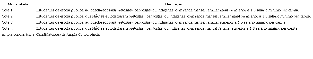 Na Universidade Federal de Viçosa (UFV) a implantação da reserva de vagas iniciou-se no ano de 2013 e, de forma gradual, conforme a previsão legal, o percentual de 50% das vagas reservadas para estudantes cotistas foi atingido em 2016. Neste sentido, a amostra estudada é composta por ingressantes nos cursos da UFV-CRP por meio do SiSU/MEC de 2016 a 2020. As modalidades de vagas reservadas e de ampla concorrência estão detalhadas no Quadro 1.