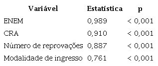 Para análise dos dados, foi utilizado o teste de média. As variáveis submetidas à análise estatística para a comparação das médias entre estudantes cotistas e não cotistas foram a nota do ENEM, o CRA e o número de reprovações. O teste estatístico indicou que todas as variáveis analisadas não seguem uma distribuição normal, como todos os p-valores significativos, levando a rejeição da hipótese de normalidade, conforme demonstrado na Tabela 1.