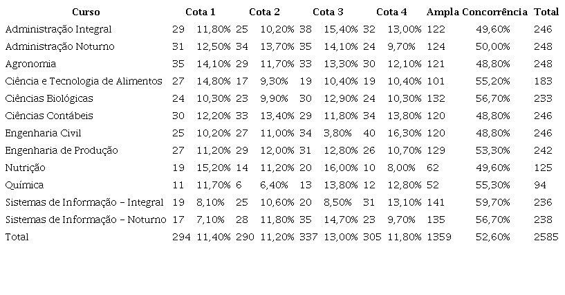 A maior incidência de estudantes ingressantes pela cota 1 (estudantes de escola pública, com critério de cor/racial/étnico, com renda mensal familiar igual ou inferior a 1,5 salário mínimo per capita) ocorre nos cursos de agronomia e ciência e tecnologia de alimentos. Nos cursos de administração integral e noturno, ciências biológicas, engenharia de produção, nutrição, química e sistemas de informação noturno, entre estudantes cotistas, ocorre maior incidência daqueles que ingressaram pela cota 3 (estudantes de escola pública, com critério de cor/racial/étnico, com renda familiar mensal superior a 1,5 salário mínimo per capita).