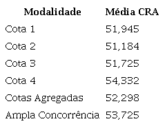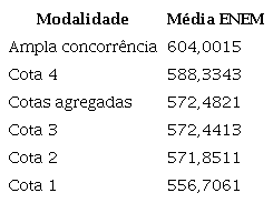Entre as modalidades de cotas, os ingressantes provenientes da cota 4 (estudantes de escola pública, sem critério de cor/racial/étnico, com renda mensal familiar superior a 1,5 salário mínimo) apresentaram as melhores médias, enquanto as menores médias são de estudantes oriundos(as) da cota 2 (estudantes de escola pública, sem critério de cor/racial/étnico, com renda mensal familiar igual ou inferior a 1,5 salário mínimo per capita).