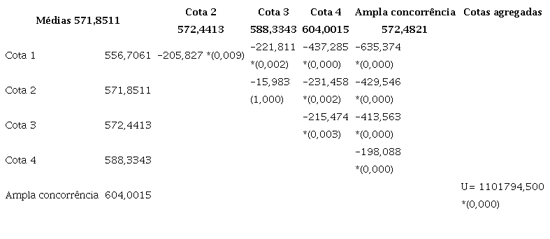 Foi realizada a análise de post hoc de Mann-Whitney da relação entre cada categoria, bem como da agregação de todas as cotas com a categoria ampla concorrência, as quais estão apresentadas na Tabela 4. Esse teste não paramétrico foi definido em decorrência dos dados das categorias analisadas não seguirem distribuição normal e do tamanho da amostra.