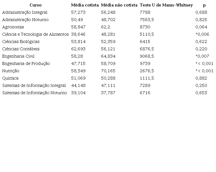 Quanto à nota de ingresso de estudantes cotistas e não cotistas, no período analisado, foi encontrada diferença estatística significativa. Os resultados apontaram que a média das notas no ENEM de estudantes da ampla concorrência (não cotistas) foi superior à nota média de estudantes cotistas.