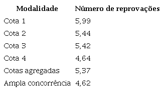 A análise do número de reprovações partiu da hipótese proposta neste estudo de que não há diferença estatística significativa entre a média do número de reprovações de estudantes cotistas e não cotistas, assim como nas demais variáveis analisadas. A Tabela 7 apresenta os valores das médias do número de reprovações por modalidade de ingresso na UFV-CRP, cotas 1, 2, 3, 4, ampla concorrência e as cotas agregadas (modalidades 1, 2, 3, 4).