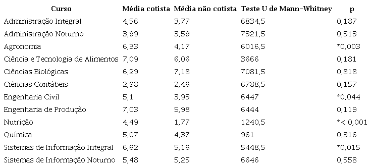 A Tabela 8 revela que há diferença estatística significativa apenas em quatro dos doze cursos investigados. Nos cursos de agronomia, engenharia civil, nutrição e sistemas de informação integral há diferença estatística na distribuição da média do número de reprovações, sendo o número de reprovações de estudantes cotistas superior à média de reprovações de estudantes não cotistas.