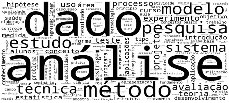 O total de disciplinas relacionadas à estatística é de 12.552. Para a avaliar o conteúdo destas disciplinas, temos na Figura 1 a apresentação da nuvem de palavras gerada pelos textos contidos em suas ementas.