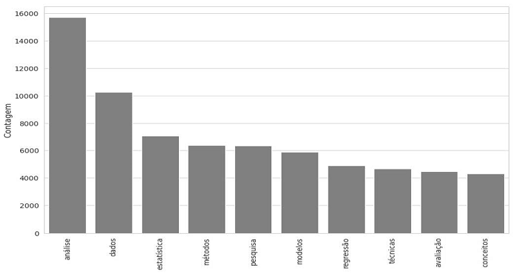 As palavras mais proeminentes nas ementas são: “análise, dado e método”. Apesar de muitas palavras não estarem diretamente relacionadas à estatística, a nuvem é composta das palavras mais presentes nas ementas. Outra maneira de avaliar as palavras é utilizar a contagem das em todas as ementas. Na Figura 2, a seguir, está a frequência das 10 palavras mais comuns.