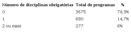 Apesar da grande quantidade total de disciplinas, com a mediana oscilando de 25 na área de Ciências da Saúde até 42 em Ciências Exatas e da Terra, a quantidade de disciplinas obrigatórias é pequena. A mediana oscila entre 1 a 3 disciplinas obrigatórias por programa e na área de Ciências da Saúde o terceiro quartil é de 7. A área de Ciências Exatas e da Terra, apesar de ter o maior número total de disciplinas nos três pontos avaliados (primeiro quartil, mediana e terceiro quartil), não apresenta o maior número de disciplinas obrigatórias. A área com o maior número de disciplinas obrigatórias é Ciências da Saúde (mediana de 3 e terceiro quartil de 7), seguida pela área de Ciências Sociais Aplicadas (mediana de 3 e terceiro quartil de 6).