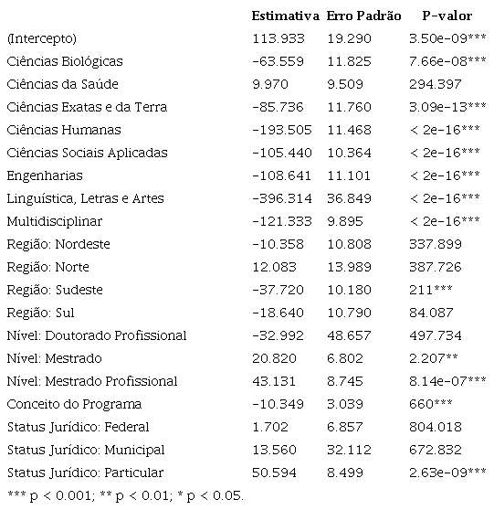 Foi possível observar que, no geral, apesar da grande oferta de disciplinas pelos programas de pós-graduação, a quantidade de disciplinas obrigatórias é pequena. Esse fato se traduz em poucas disciplinas obrigatórias de estatística. Com isso, por exemplo, a quantidade de disciplinas relacionadas à estatística está diretamente ligada à nota do programa de pós-graduação na Capes. Porém, essa relação se inverte ao considerarmos apenas as disciplinas obrigatórias. Ademais, é mais provável encontrar disciplinas obrigatórias relacionadas à estatística em programas das áreas de Ciências Agrárias e de Ciências da Saúde do que em programas de outras áreas do conhecimento. Além disso, programas de mestrado profissional apresentam maior probabilidade de possuírem disciplinas obrigatórias relacionadas à estatística do que programas em outros níveis de formação.